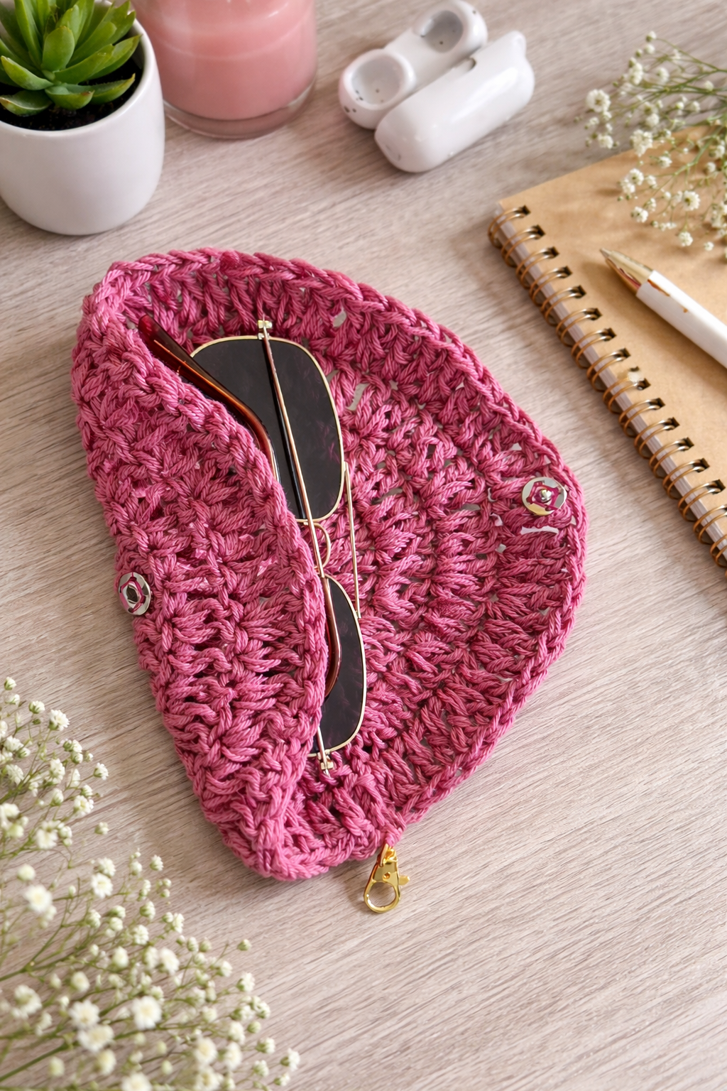 Diese liebevoll handgehäkelte Brillenhülle schützt deine Sonnen- oder Lesebrille zuverlässig vor Kratzern und Staub.